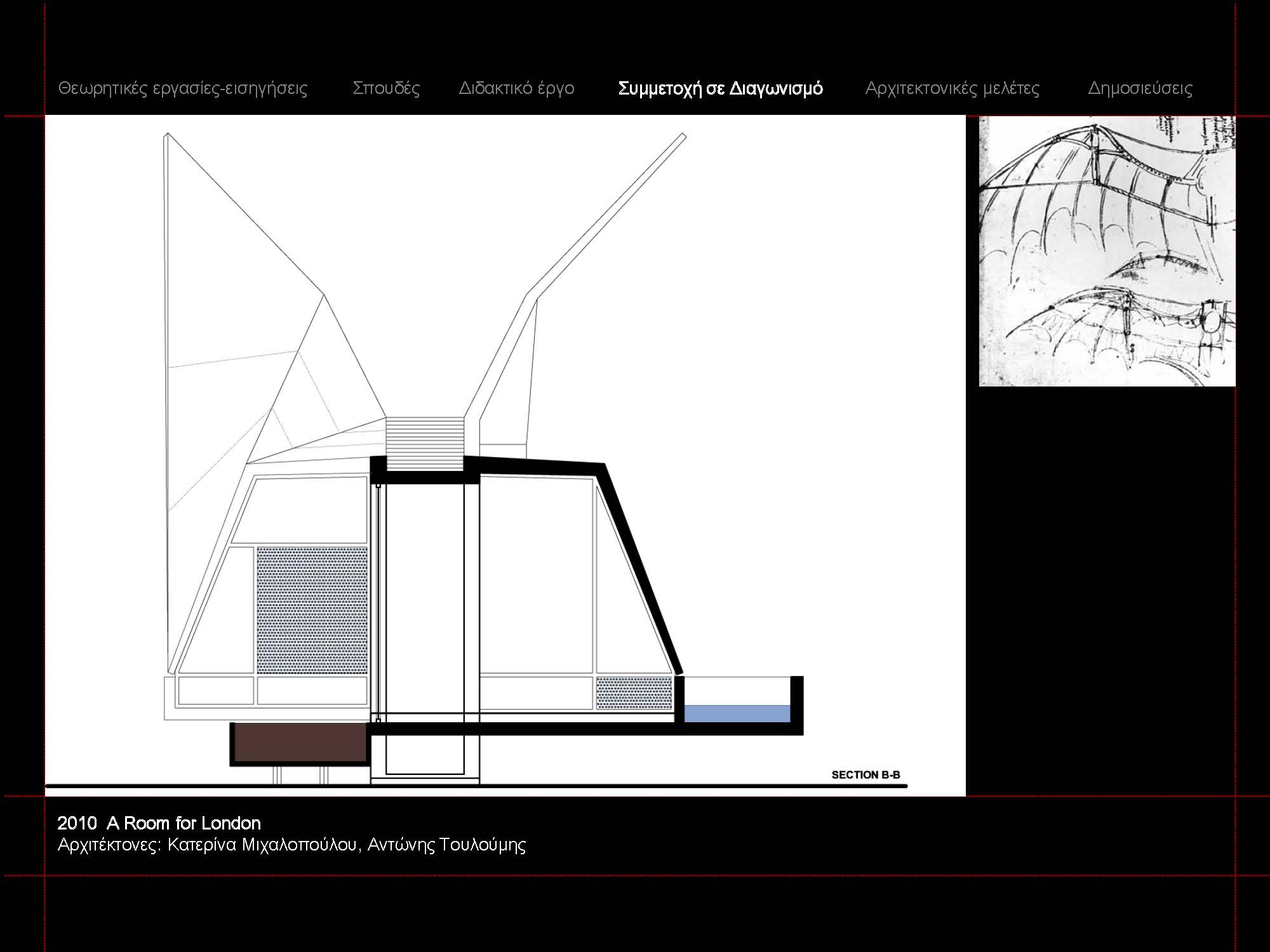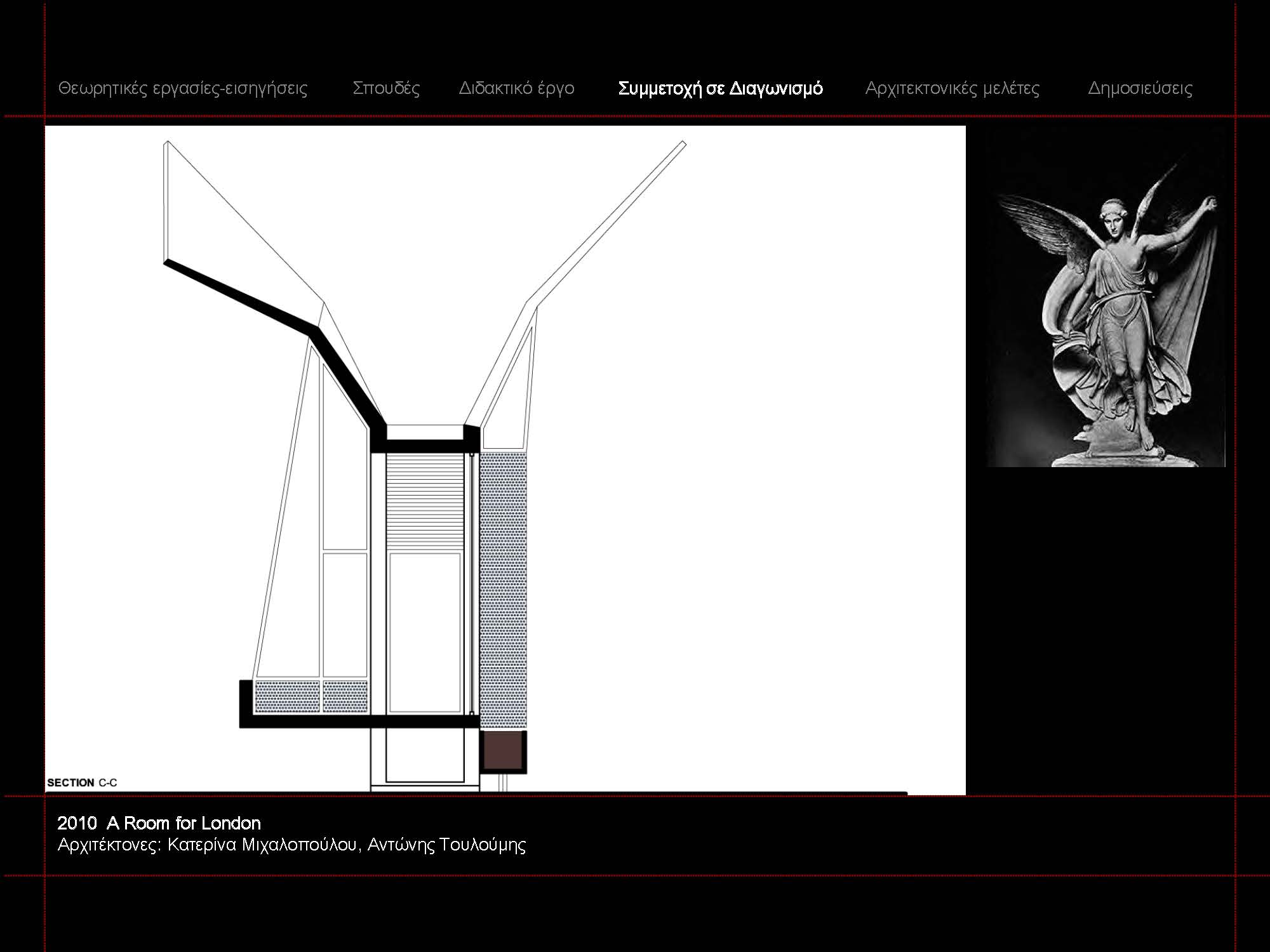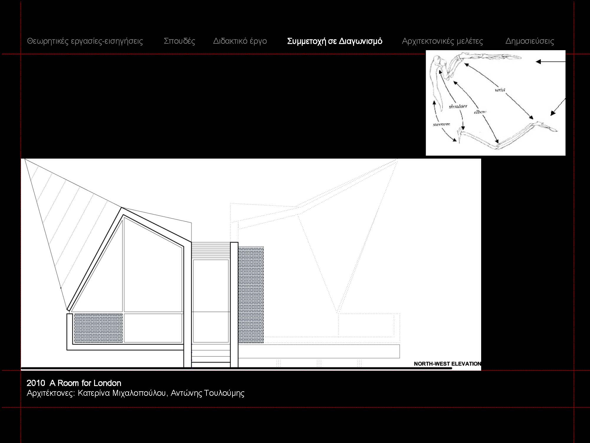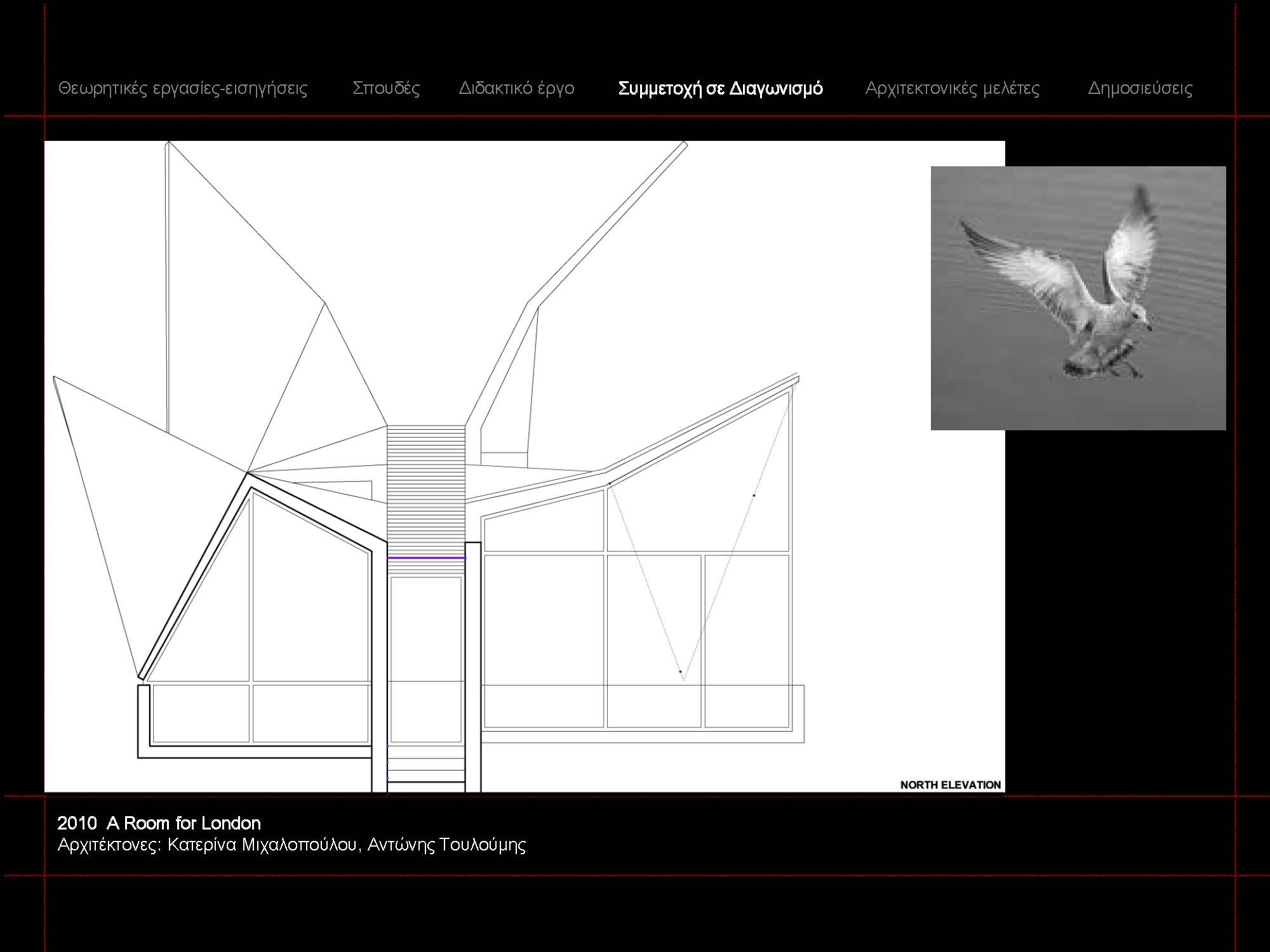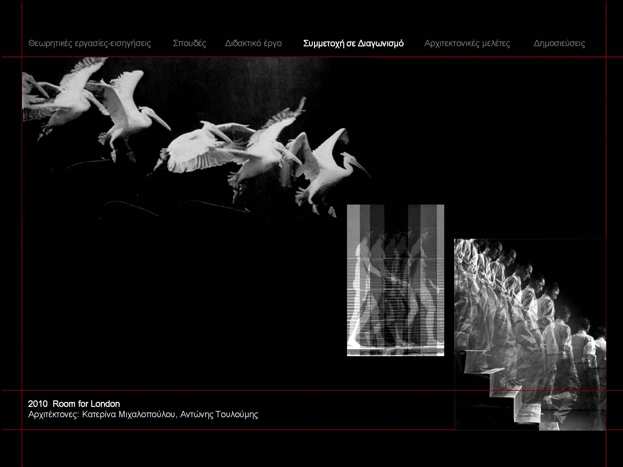 Αντώνης Τουλούμης (έτος γέννησης 1972). Αρχιτέκτων Μηχανικός Ε.Μ.Π. Διδάκτωρ του Tμήματος Αρχιτεκτόνων Μηχανικών Ε.Μ.Π. με θέμα διδακτορικής διατριβής: «Η εγγραφή της χρονικής εμπειρίας στον αρχιτεκτονικό σχεδιασμό: η σκάλα ως σημείο άρθρωσης της χρονικής γλώσσας». Κάτοχος μεταπτυχιακού διπλώματος του διατμηματικού προγράμματος Μεταπτυχιακών Σπουδών του Τμήματος Αρχιτεκτόνων Μηχανικών Ε.Μ.Π. με κατεύθυνση «Σχεδιασμός, Χώρος, Πολιτισμός» ως υπότροφος σπουδαστής του ΙΚΥ. και του μεταπτυχιακού προγράμματος «Ψηφιακές Μορφές Τέχνης» της Ανωτάτης Σχολής Καλών Τεχνών. Έχει τελέσει επί σειρά ετών επικουρικό διδακτικό έργο στον τομέα ΙΙΙ της σχολής Αρχιτεκτόνων ΕΜΠ.