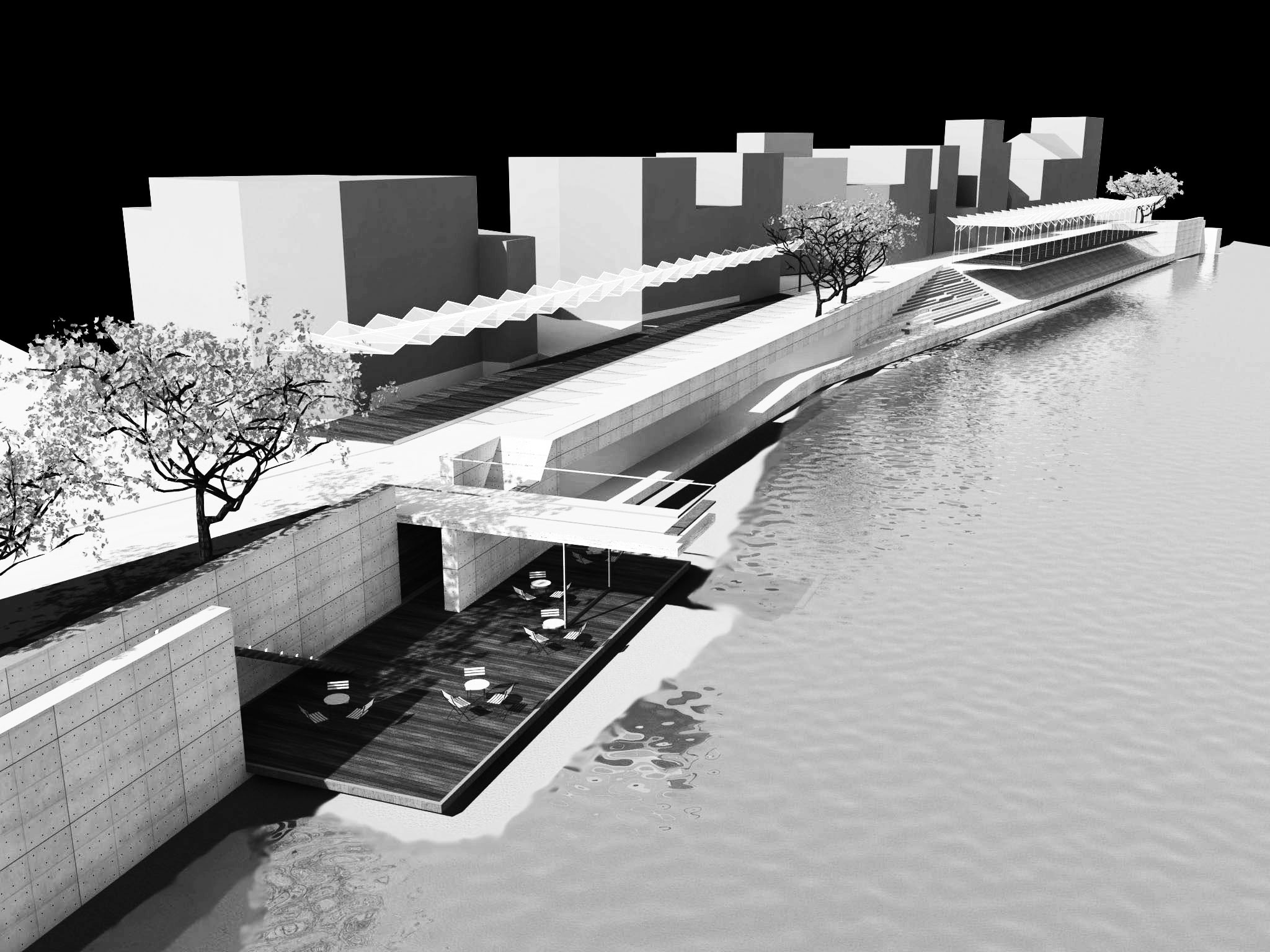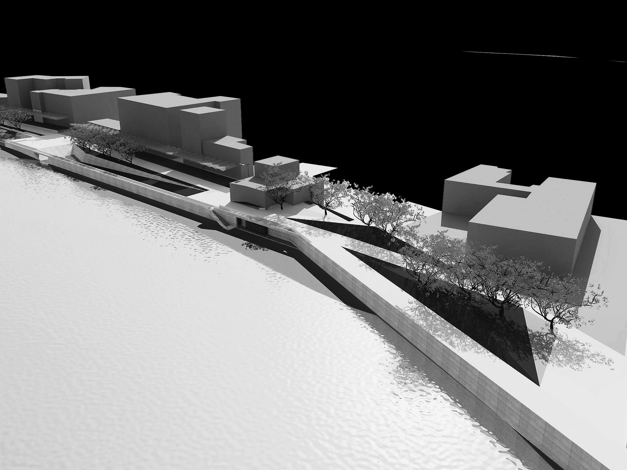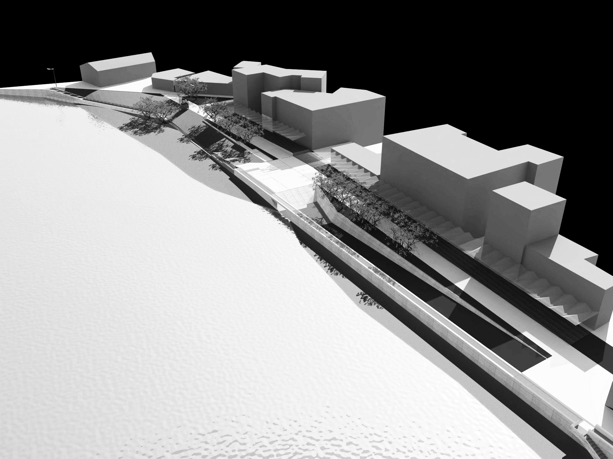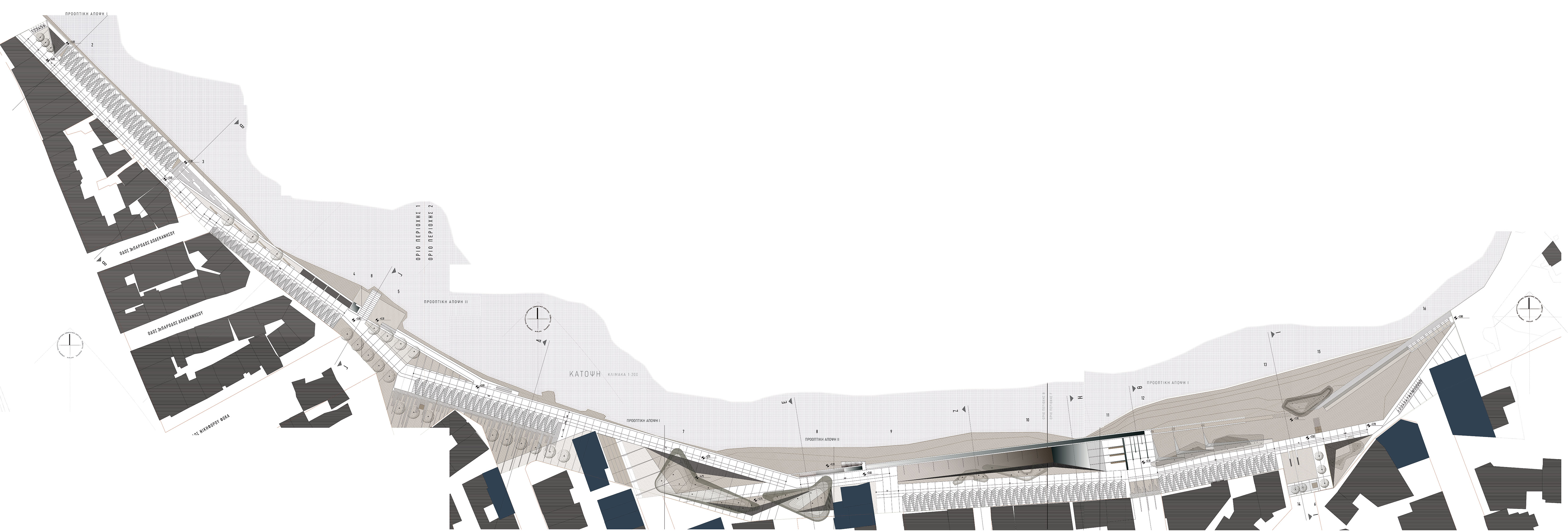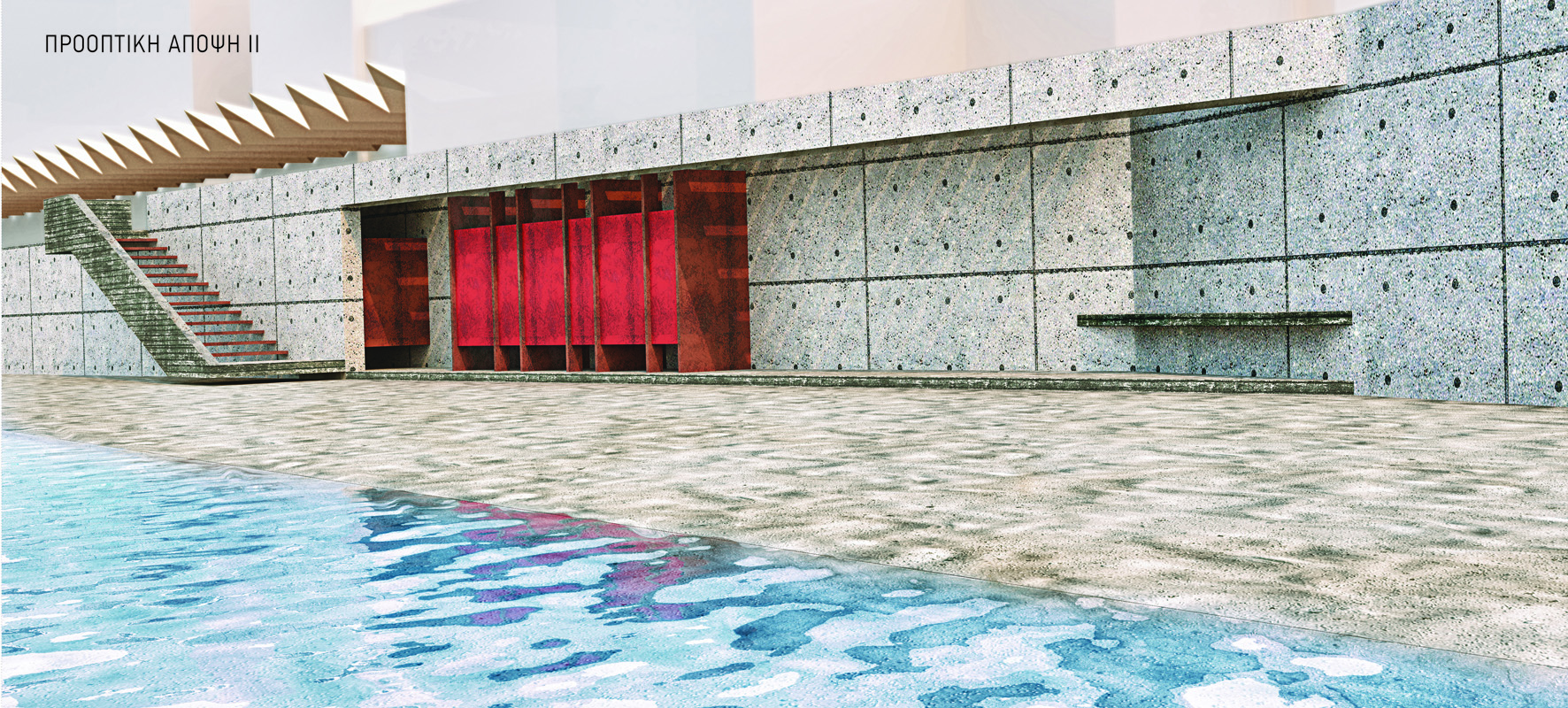 Η ανατολική κεραία του σταυρού, ίσου μεγέθους με τις προηγούμενες, στεγάζεται με οριζόντιο επίπεδο, το οποίο αποκολλάται από τα κατακόρυφα φέροντα στοιχεία μέσω οριζόντιας φωτεινής σχισμής. Η απόληξη της διαμορφώνεται από τους όγκους της αψίδας του ιερού βήματος, της πρόθεσης και του διακονικού. Αυτοί αντιμετωπίζονται γλυπτικά ως παραλλαγές του βασικού θέματος, που είναι η ημικυλινδρική αψίδα. Στην περιοχή που άλλοτε τοποθετούνταν το αμφιθεατρικό σύνθρονο, προσαρμόζεται μία κλίμακα προς την υπόγεια κατακόμβη και τους απαραίτητους βοηθητικούς χώρους των κληρικών.