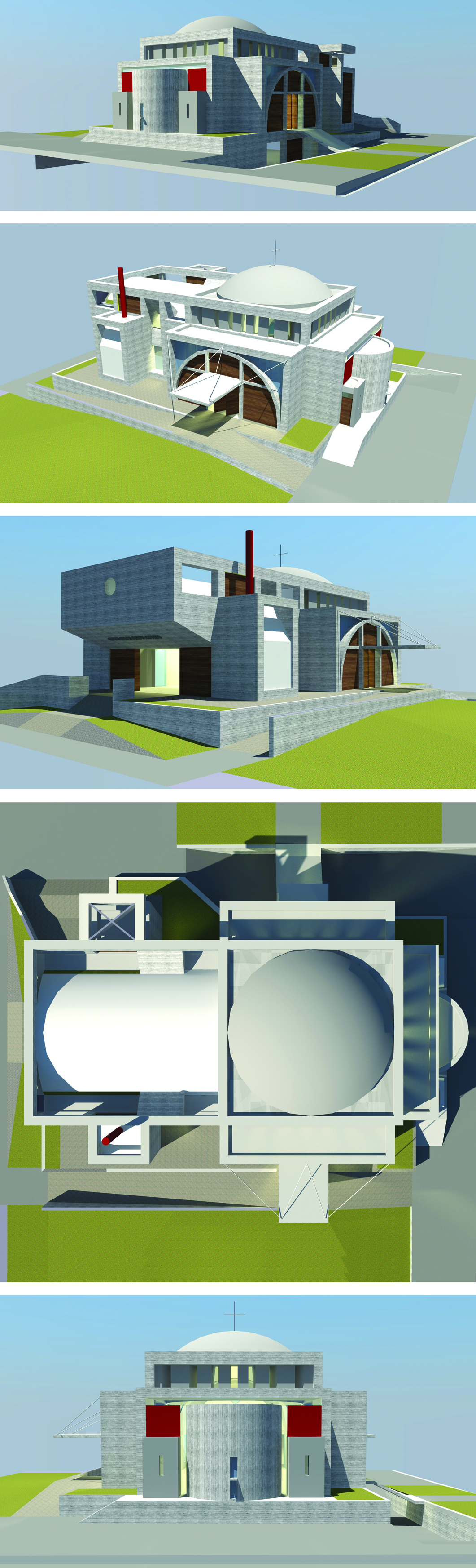 Το οικόπεδο χωροθετείται στο οικοδομικό τετράγωνο 573 του Δήμου Νέας Κηφισιάς (Αδάμες).Η θέση και το ερυθρό περίγραμμα του κτιρίου είναι δεδομένα και σχετίζονται με την βορειοανατολική γωνία του οικοδομικού τετραγώνου. Το εμβαδόν του οικοπέδου είναι 840 τμ, η κάλυψη 336 τμ, η δόμηση 504 τμ και το ύψος 8,5 μ.Πρόκειται δηλαδή για ένα αστικό ναό, σε ένα μικρό σχετικά οικόπεδο, με χαμηλά ύψη. Αυτά τα στοιχεία αποτελούν και χαρακτηριστικά του αστικού ιστού της περιοχής. Η ανάλυση του κτιρίου σε μικρού μεγέθους στοιχεία, τα μικρά ύψη, και η κατάργηση της αρχικής συμμετρίας της κάτοψης, ώστε το κτίριο να απαντά στις διαφορετικές γειτνιάσεις κάθε πλευράς του, ήταν οι παράμετροι που καθόρισαν την ένταξή του στο υφιστάμενο αστικό τοπίο. Το προτεινόμενο κτίριο, ανήκει στην τυπολογία των ελεύθερων σταυροειδών με τρούλο ναών. Η σχετικά αναγνωρίσιμη σταυροειδής μορφή σε κάτοψη, παρουσιάζει αρκετές «ιδιομορφίες» στο χώρο. Τέσσερα τοιχία σχήματος ισοσκελούς «Γ», πλευράς 3.00 μ. τοποθετούνται στις γωνίες του τετραγώνου, ορίζοντας τόσο τον κεντρικό χώρο του ναού -τον κύβο- όσο και τις κεραίες του ελεύθερου σταυρού. Το ανατολικό και δυτικό σκέλος είναι ισομεγέθη, στεγάζονται ομοιότροπα με κυλινδρικούς θόλους και πάνω από αυτούς με οριζόντια επίπεδα. Τα τύμπανα των θόλων, φράσσονται με ξύλινα διαφράγματα, ενώ τα μεταξύ των θόλων και οριζόντιων πλακών κενά, διαμορφώνονται με υάλινα πετάσματα.